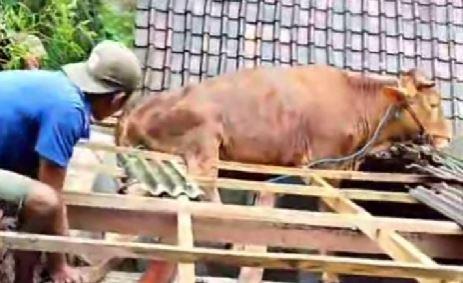 Situasi menjadi kacau balau ketika pedet sapi melarikan diri sedangkan induknya justru berulah dan naik ke atas atap rumah milik Sudarmi.
